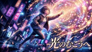 ネオンの夜を歩きながら夢と現実のあいだで自分のリズムを取り戻し、光の向こうへ飛び込む勇気を描いた希望の歌詞。昨日を越えて未来へ進む前向きなストーリー。